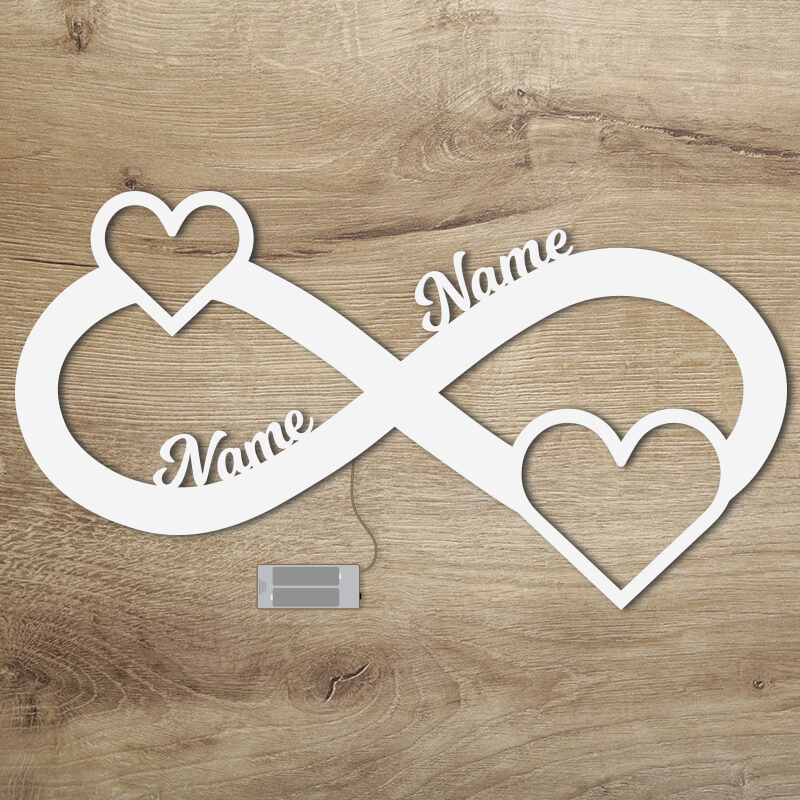 Unsere Hochzeitsgeschenke mit -Beleuchtung hüllen jeden Raum in ein romantisches Licht - genau das Richtige also für zwei Menschen, die bis über beide Ohren verliebt sind. Die Beleuchtung ist indirekt angebracht, sodass das Infinity Motiv am Abend spektakulär hinterleuchtet wird. Das Unendlichkeitszeichen steht symbolisch für die ewige Liebe der beiden frisch Vermählten. Die elegant geschwungenen Namen und zwei Herzen runden dieses ausgefallene Hochzeitsgeschenk ab.