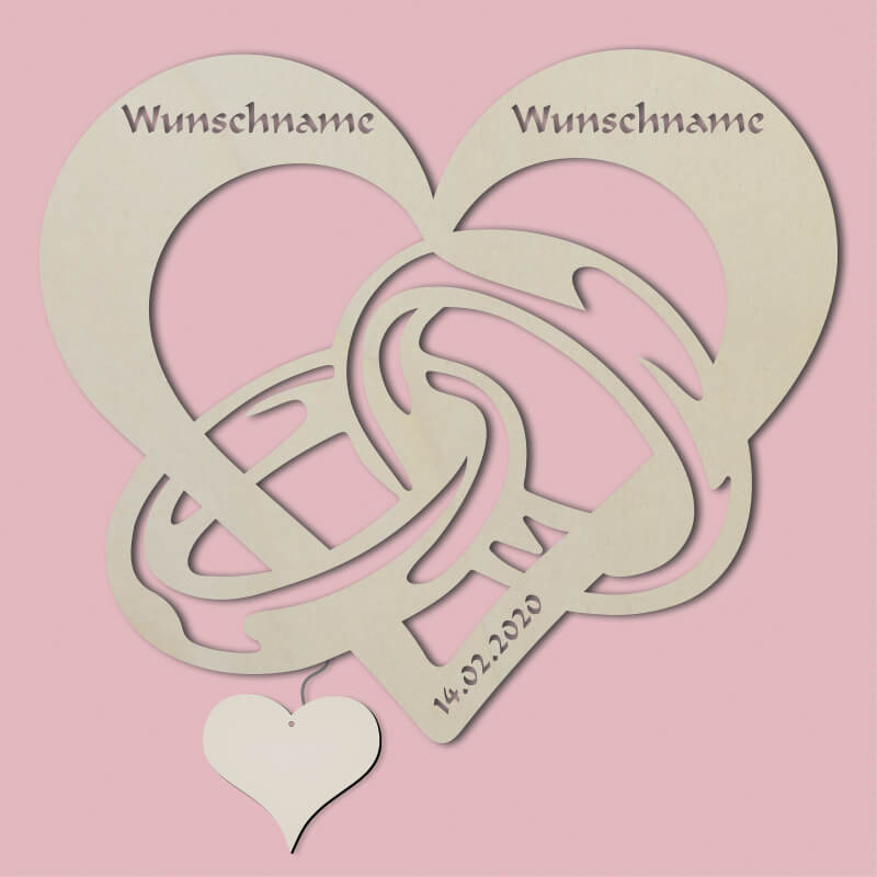 Mit unserer Deko Wand Nachtlampe in Form eines Herzes, das zwei Ringe miteinander verbindet, hast Du das ideale Geschenk für das glückliche Brautpaar gefunden. Die LED Lampe ist individuell mit Namen und Wunschdatum gestaltbar. Das romantische Motiv wird durch LED Licht indirekt beleuchtet und ist daher bei Tageslicht, aber auch im Dunkeln, ein echter Blickfang. Das Holz Herz mit Ringen ist aus hochwertigem Pappelsperrholz gefertigt und mit einem exklusiven Zugschalter ausgestattet. Der Betrieb erfolgt über zwei AA Batterien. Dank der energiesparenden LED Technik haben die Batterien eine hohe Lebensdauer. So kann das tolle Geschenk überall aufgehängt werden und wird in seiner schönen Optik nicht durch ein Stromkabel gestört. Die Wahl der Farbe bleibt ebenfalls Dirüberlassen. Du kannst wählen zwischen unbehandeltem Holz oder aus einer großen Farbpalette, von Weiß über Schwarz und Grau bis hin zu Orange, Grün oder Hellblau.