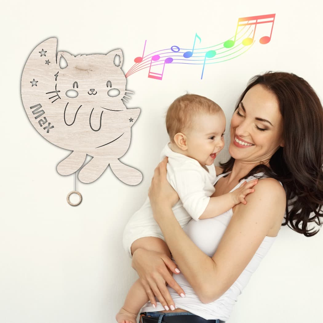 Kinder Nachtlicht mit Spieluhr aus Holz "Kätze hängt am Mond"