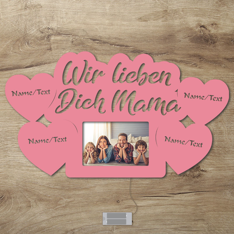 Der individuell gestaltete, extra für Deine Mutter angefertigte Rahmen aus Pappelsperrholz lässt sich überall an der Wand platzieren. 20 LEDs beleuchten das hochwertige Deko-Objekt gleichmäßig und lassen Deine liebevollen Textbotschaften in einem angenehmen Licht erstrahlen. Optional kannst Du eine UV-Schutz-Abdeckung aus Acrylglas mitbestellen, die dafür sorgt, dass das in dem Bilderrahmen platzierte Foto nicht verblasst. Die Abdeckung montieren wir - so musst Du nur noch ein passendes Lieblingsfoto auswählen, um Deine Mutter mit dem originellen Geschenk zu überraschen.